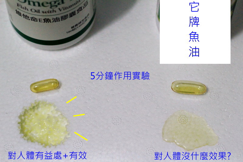 右邊它牌魚油,一直都沒有溶解保麗龍啊!!!!(有效嗎!?)